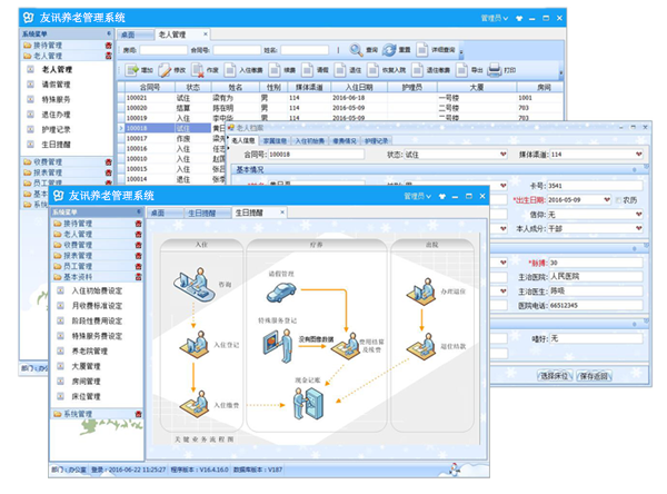 涵盖收费、居住、档案、护理、员工管理等,涉及从接待到退房的所有业务流程。通过精简流程、科学管理提高养老机构管理效率,减少资源浪费,提升核心竞争力。