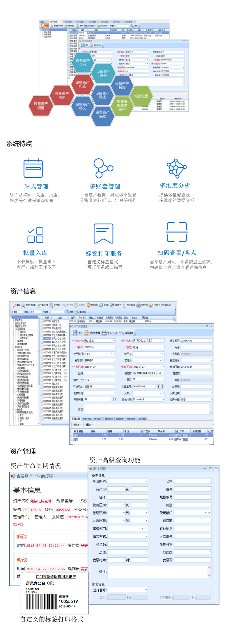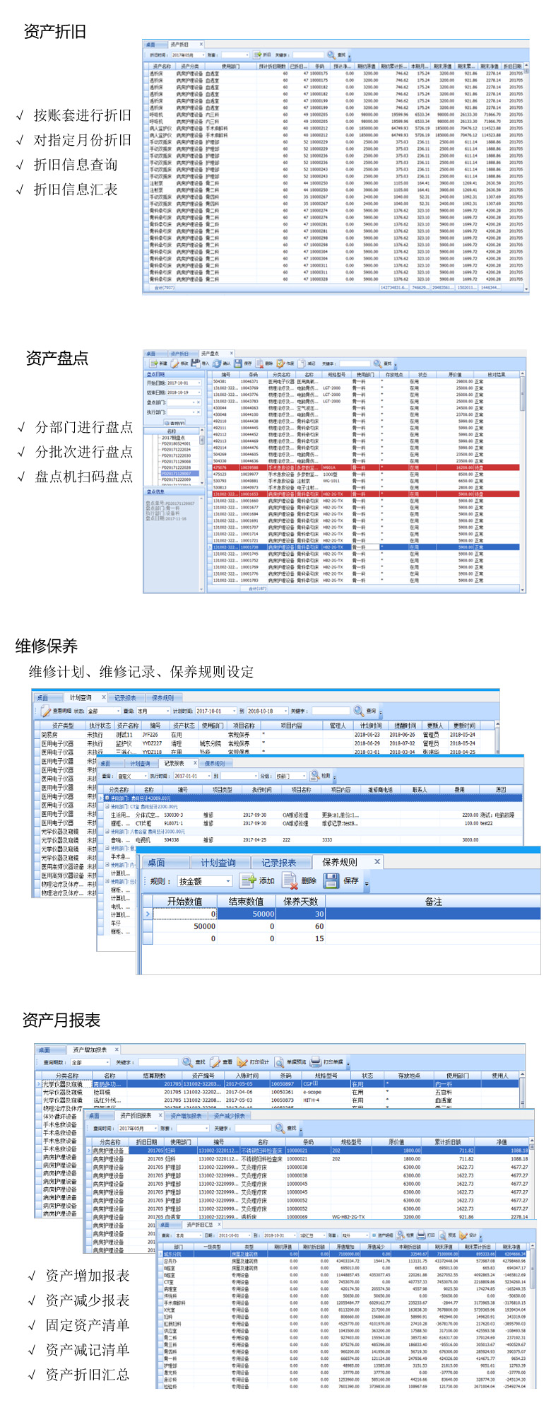 采用条码技术提升资产领用、盘点、维修、报废等管理效率; 智能提醒确保资产定期保养;实现固定资产的全面监控和有效利用; 一份资产数据管理多个帐套信息。