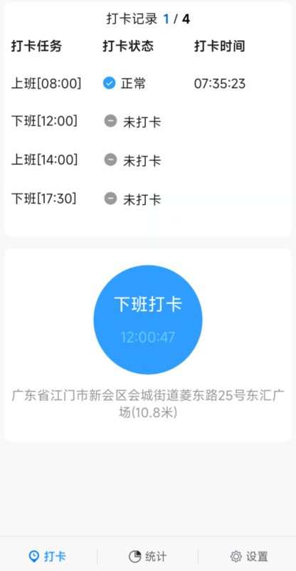 员工在上下班的指定时间段内完成打卡任务。打卡时需要在管理员设置的打卡地点范围以内,并且开启定位功能,否则不能进行打卡操作。