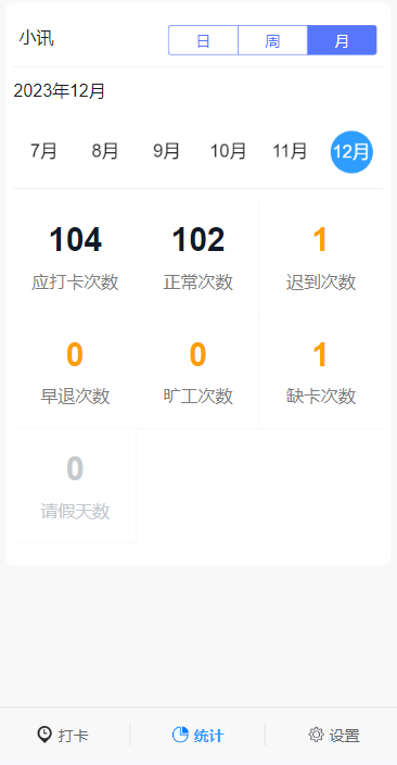 出勤人员一目了然;智能统计考勤数据,无需安装下载,关注公众号即可使用,自动生成日报表、周报、月报表,统计数据一目了然,轻松高效。