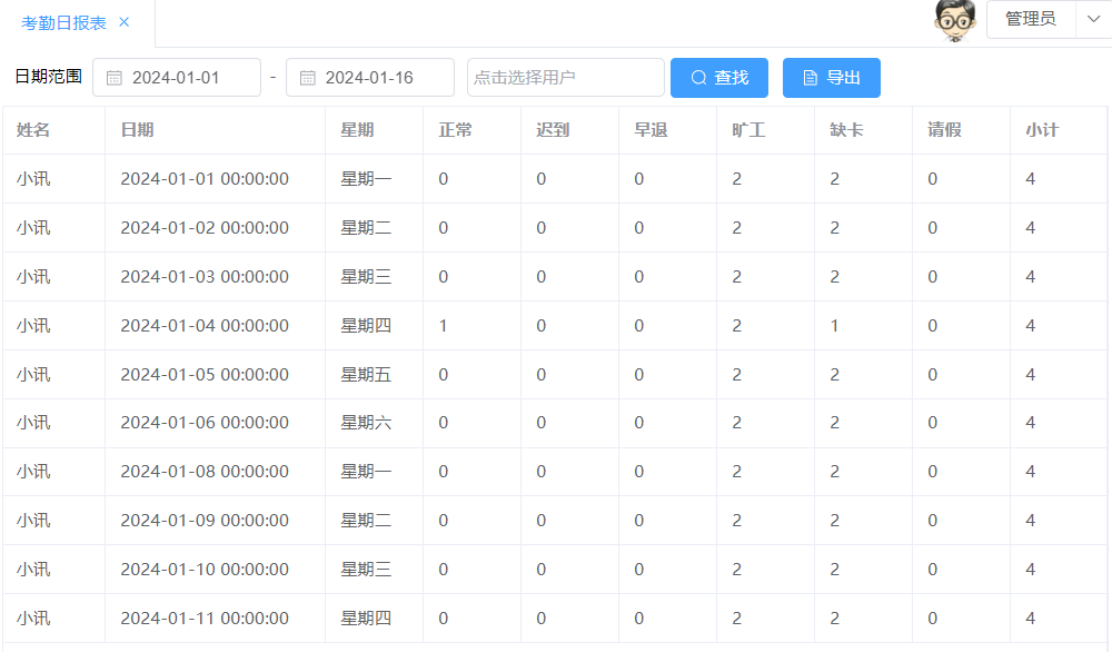 (1)全体员工日报表,支持导出功能