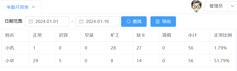 (2)全体员工月报表,支持导出功能