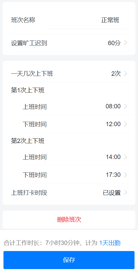 主要功能:增减班次、设置班次名称、该班次的上下班次数、各班次的上下班时间、打卡时段、显示班次上班时长。