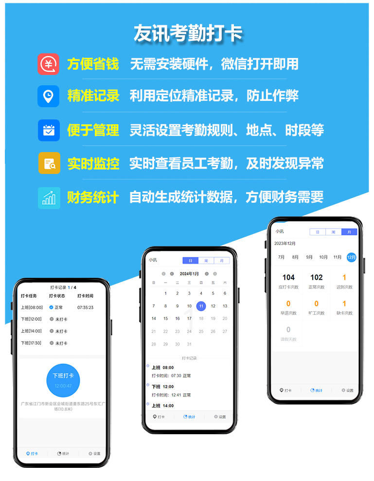友讯考勤打卡致力于为企业提供一套简单便捷的员工考勤管理的解决方案,随时随地了解团队状态,
