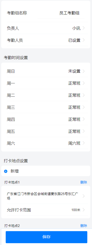 主要功能:增减考勤组、设置考勤名称、负责人、考勤人员、设置每天班次、打卡地点、打卡范围。