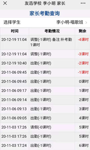 考勤提醒实时发送到家长微信,实时了解上课情况,并可随时查询课程剩余数量。