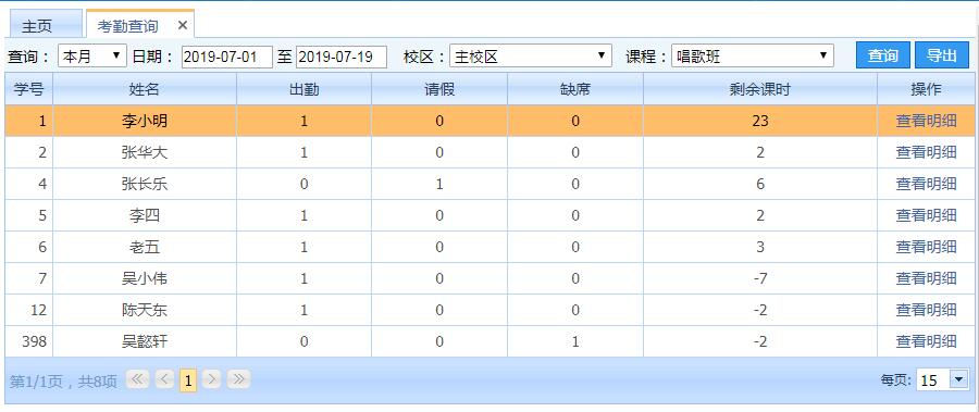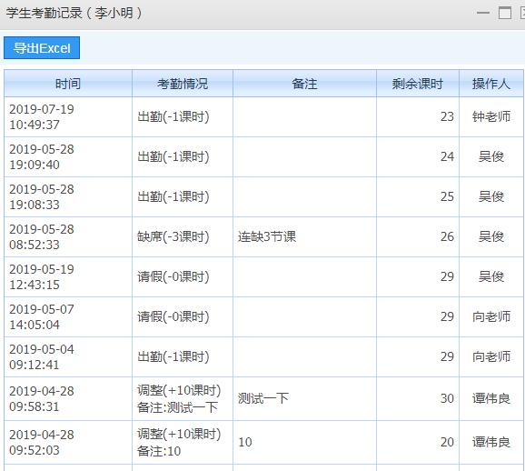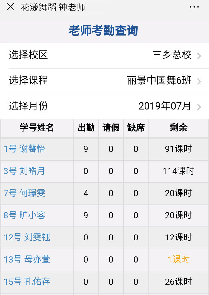 老师可随时查看各个班学生的考勤情况,及时提醒需要续费学生。