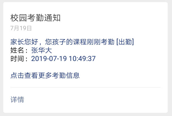 点名提醒信息即时发送至家长微信,点击查看详情。