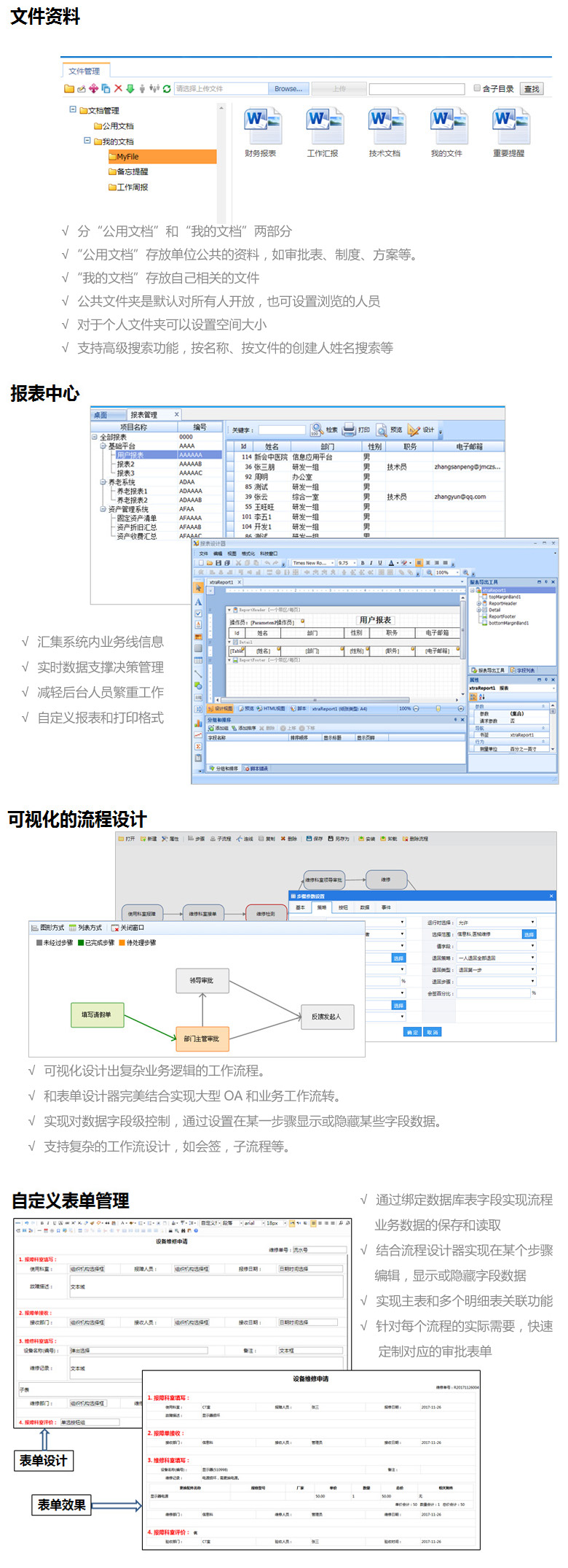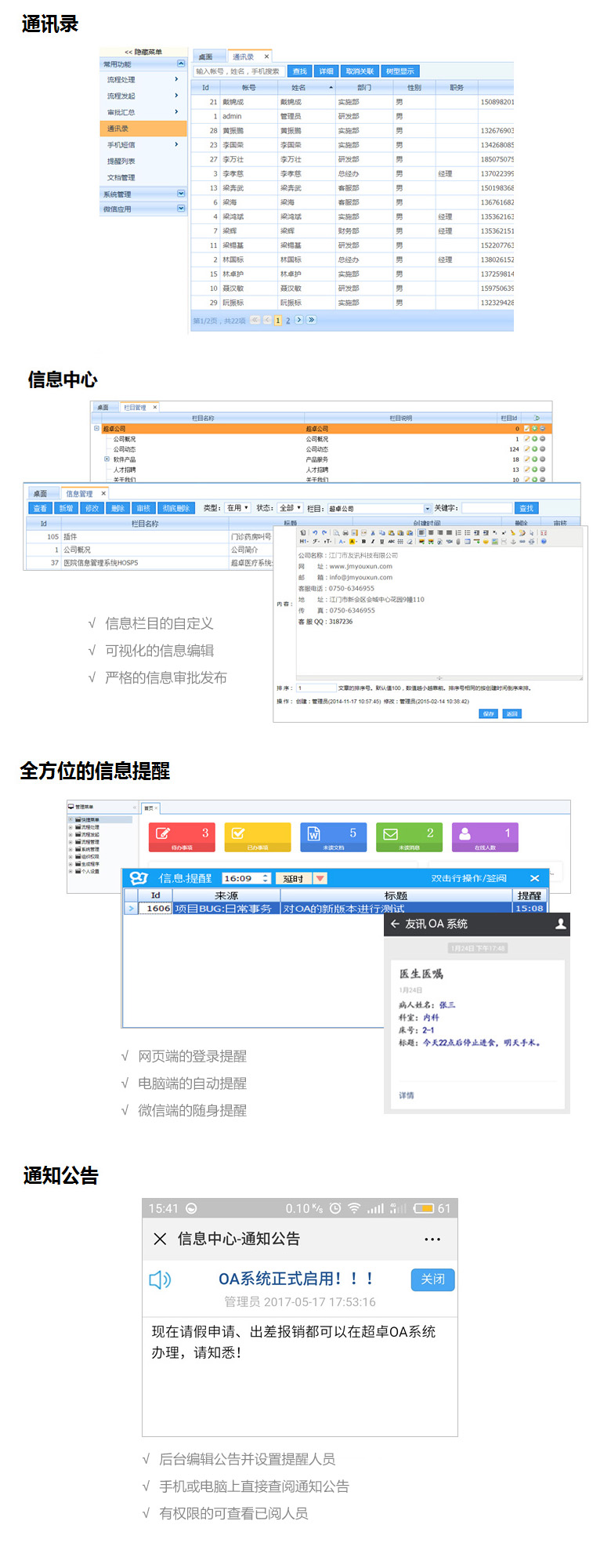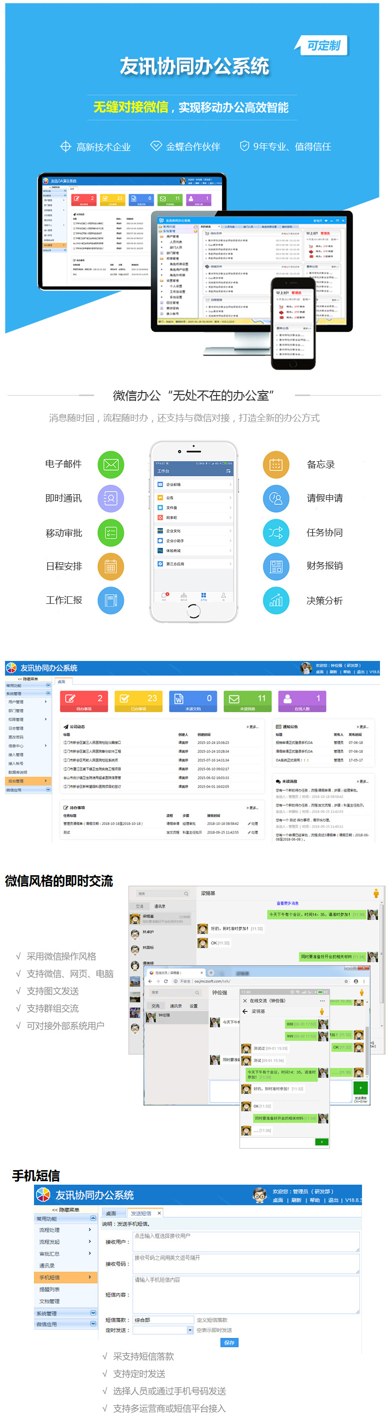 现代企业协同办公综合解决方案,提供即时交流、通讯录、收发文管理、多部门流程审批、文档管理、短信收发等功能, 全面提升企业的管理模式和运作效率,提供桌面应用、网页浏览、手机微信等全方位接入。