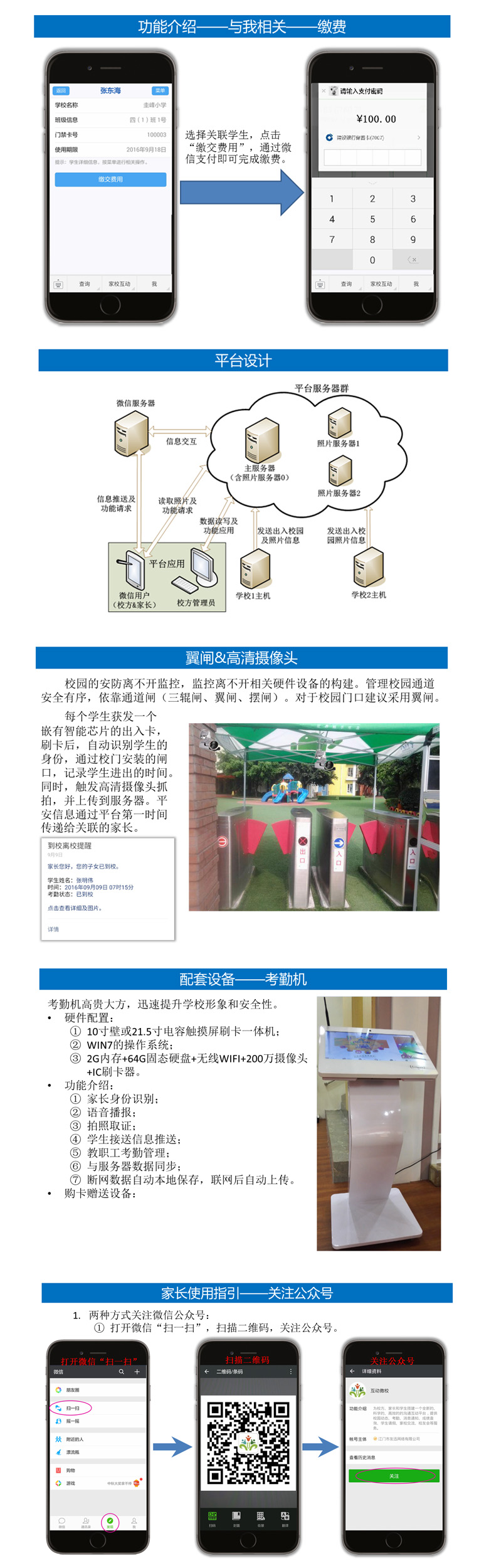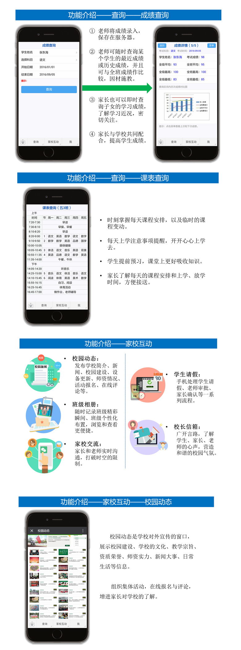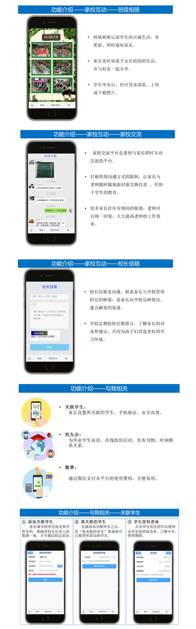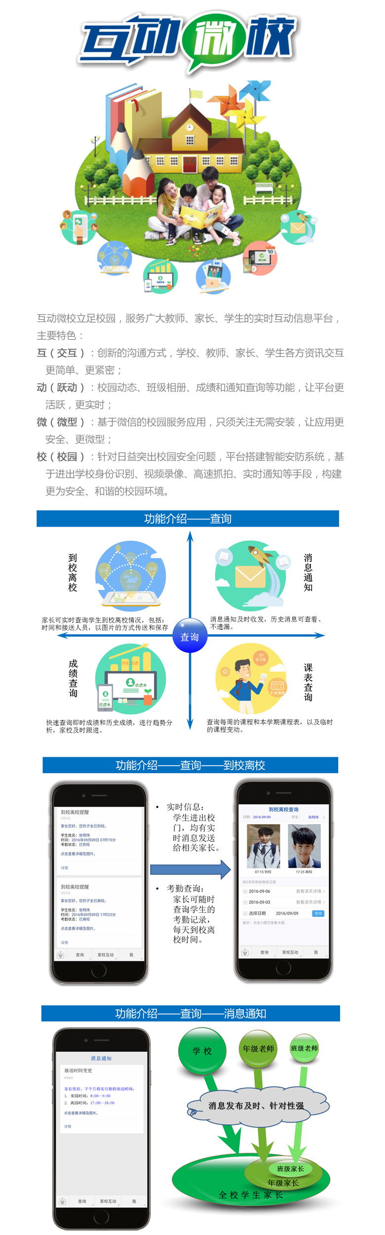 互动微校立足校园,通过创新的沟通方式, 利用校园动态、班级相册、通知公告等特色功能让学校、教师、家长、学生各方资讯交互更简单、更紧密; 同时针对日益突出校园安全问题,平台搭建智能安防系统, 基于进出学校身份识别、视频录像、高速抓拍、实时通知等手段,构建更为安全、和谐的校园环境。